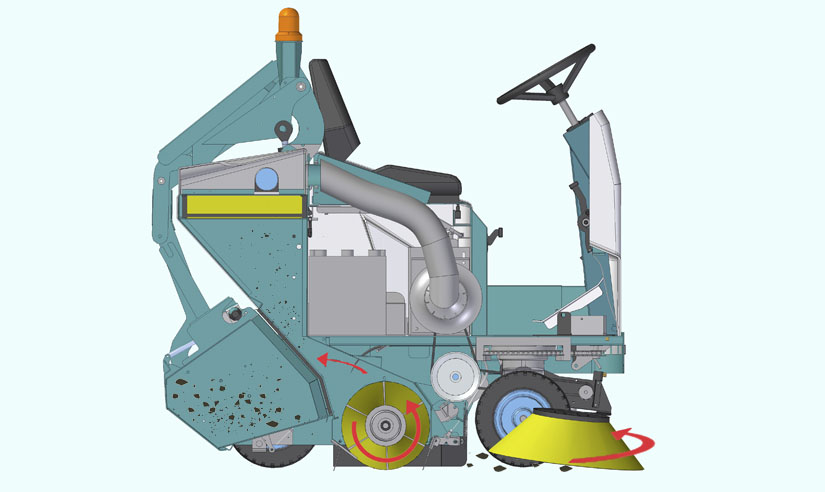 Estas máquinas, en lugar de basarse solo en la aspiración, combinan el barrido mecánico y la aspiración para recoger los residuos y, sobre todo, las partículas finas. El barrido rotativo empuja el material hacia el sistema de recogida, mientras que la aspiración captura las partículas más pequeñas, evitando que se dispersen en el aire.